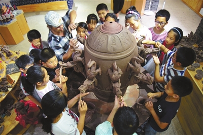 近日,在建德市明珠小学陶艺室里,陶艺兴趣班的30多名学生在民间艺人余一夫老师的带领下,一起为一件已经花了近两个月时间精心创作的泥塑浑天地动仪进行最后的细节修整,为校园文化增辉添彩。