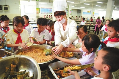 昨日,建德市寿昌第一小学30多名留守儿童在老师指导下,一起开心地包粽子、做香包。