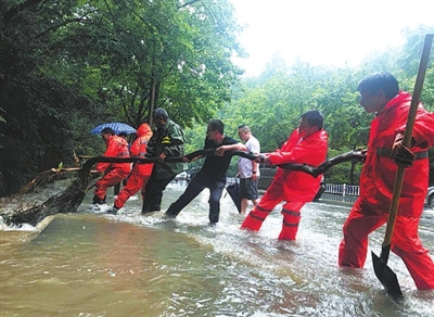 | 昨日,杭州景区市政市容局职工正在处理积水。通讯员蒋虹 摄 |