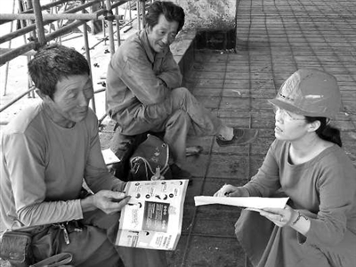 图为日前“工情直通车”工作人员正在誉江南小区一工地上向一线职工了解他们的诉求。