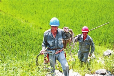 7月3日,国网庆元县供电公司员工在完成35千伏白新3622线27号立杆架线工作后,顶着烈日匆匆赶往下一个工作点。白新3622线是庆元县第一条35千伏线路,是联络庆元西部电网的主要线路,现已运行30余年,线路老化需进行线路改造。电力工人们不顾炎热,争分夺秒,加快工程建设步伐,确保迎峰度夏期间电网安全稳定运行。