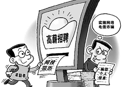 有的不法分子以印刷厂、广告公司等名义,在网络上发布应聘信息,让应聘者点击植入病毒的木马链接,一旦中了病毒,应聘者就会被不法分子盗取银行卡账户、支付宝邮箱等敏感信息。