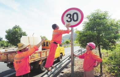 连日来,江山市公路段一线职工头顶烈日,奋战在公路养护最前线,维护道路安全畅通,成为一道道“靓丽”风景线。图为养护工人在315省道陈家安路段,扶正清洗公路标志牌。毛志强