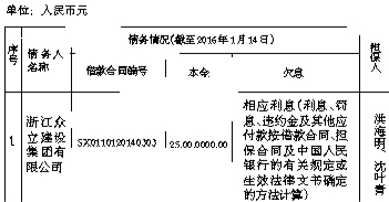 | 单位: 人民币元 注:1. 清单中“担保人”包括保证人、抵押人、出质人,担保人的担保范围以签署的合同等法律文件约定为准。如公告中债务人、合同编号、债权金额、担保人等信息与事实不符的,以签署的合同等法律文件约定为准。 2. 本公告清单列示截至2016年1月14日的贷款本金余额,借款人和担保人应支付的利息、罚息、违约金及其他应付款按借款合同、担保合同及中国人民银行的有关规定或生效法律文书确定的方法计算,实际计算与欠息金额不一致,以实际计算为准。 3. 若借款人、担保人因各种原因更名、改制、歇业、吊销营业执照或丧失民事主体资格的,请相关承债主体及/或主管部门代位履行义务或履行清算责任。 |