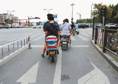 昨天中午时分,记者骑自行车路过杭州市天目山路与紫荆花路口时发现,不时有电动自行车载人上路行驶,真的很危险!