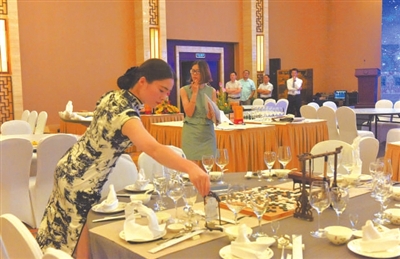 中餐宴会摆台,选手们面带微笑、步态从容,手势稳而快,铺设台布、餐巾折花、定位十张餐椅和十套餐具一气呵成,毛巾碟和筷架、酒杯和茶杯、碗碟筷勺等一应用具按照固定顺序摆放齐全,朝向、角度和间距整齐划一,评委小组会用卷尺一一测量,精确到厘米,评分标准多达几十条细则,时间却只有短短的15分钟。
