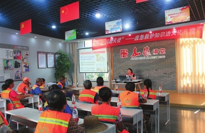 “随着气温的持续升高,环卫工人在这种条件下工作很容易出现中暑等问题。”区红十字会应急救护师陈洁以通俗易懂的语言,向一线环卫工人讲授户外高温作业中暑时的表现和救护措施。参加培训的环卫工李阿姨说:“我们每天凌晨4点就要起来工作,下班回家已是下午6点了,在户外工作时间比较长,通过这次学习,让我懂得了在工作中如何保护好自己。”