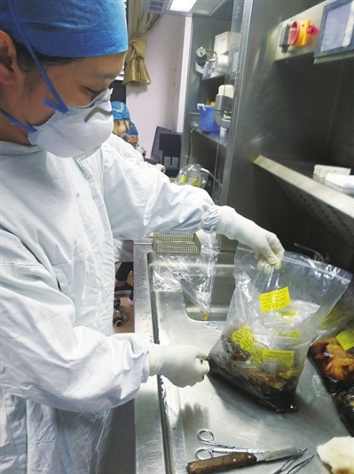 | 病理科医生刘蕴莹正在巨检室取材。 记者王艳 摄 |
