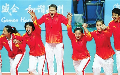 | 2010年11月27日,周苏红(左三)等中国队队员登上领奖台。当日,在第16届亚运会女子排球决赛中,中国队战胜韩国队获得冠军。 新华社记者凡军 摄 |