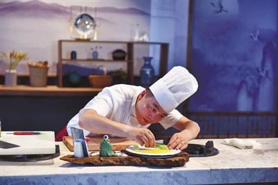 张勇工作的大华饭店就在西湖之畔。“工作之余,我喜欢站在厨房的窗边眺望风景——平静的湖面、岸边的复古游船、两岸垂柳依依,景色很美。”也许是乍现的灵感,又或是审美受到潜移默化的熏陶,张勇把这西湖一隅的风景用胡萝卜、西芹、豆腐以及各类肉制品等冷菜拼盘制成,取名“西子夜泊”。这道菜是张勇的“成名菜”,在多项厨师技能比武中脱颖而出。