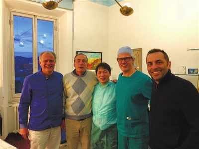 | 今年2月,徐俊峰(中)在意大利锡耶纳大学和口腔种植学教授Nicola Baldini导师(右二)一起做手术后的合影。 |