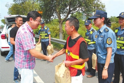 持续的高温天气给烈日下坚守公路治超、养护一线的交通人带来严峻考验,近日,龙游县交通局高温慰问组来到222省道、315省道等辖区路段,为奋战在治超、保洁、保畅通一线的路政及养护工人送上藿香正气水、人丹、风油精等防暑用品,为他们送上一份清凉与关爱。