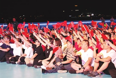 | 9月2日晚,杭州市民手摇小红旗欢呼庆祝亚运进入“杭州时间”。 |