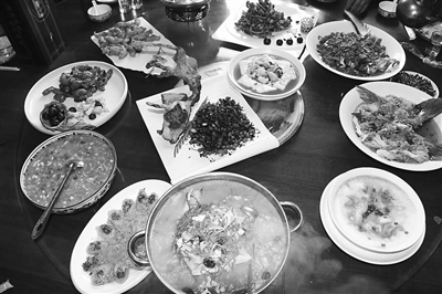 或炒、或油炸、或水煮、或煲、或羹……有咸有甜,每道菜上来,吃的人都是赞不绝口。鱼脑配以豆腐是一道菜,鱼鳞油炸后和花生、茶叶炒成一道菜,鱼肠、鱼肚腩等杂碎做成一个煲称之为“鱼散福”(武义有道名菜“猪散福”),鱼片馄饨也算一道菜,部分鱼肉则做成鱼丸,每人一小碗……十八道菜,鱼身上的每个部位都没浪费掉,且色香味俱全。12个人一桌的酒席,一条鱼就让人吃得尽兴而归。不过,从杀鱼、解剖,到十八道菜烧齐,要近4个小时的时间,真的是有些繁琐。