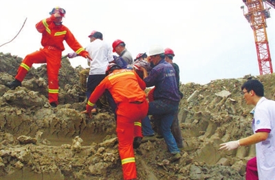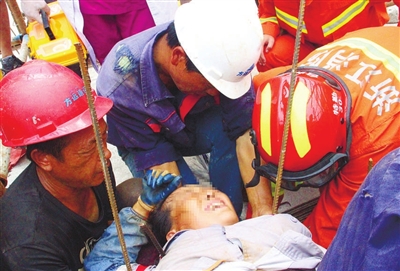 当地消防官兵、派出所民警迅速赶到现场,经过与现场的120急救人员商讨,消防官兵在做好保护措施后,利用钢筋速断器分别对受伤工人前胸和后背的钢筋进行剪切。约三分钟后,经过三次剪切,插入工人身体的钢筋顺利断开,受伤的工人被小心翼翼地抬上担架,送往医院抢救。经过紧急手术,钢筋被顺利取出,目前伤者暂时没有生命危险。通讯员何文斌、安丽娜 摄