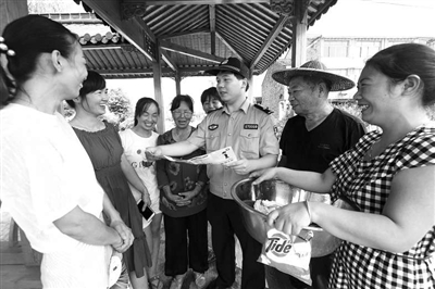近日,台州市路桥区蓬街派出所民警在辖区启明村生态洗衣房里向前来洗衣服的市民宣传防诈骗、防火灾、防盗窃等平安常识。据悉,蓬街派出所针对生态洗衣房里人员流动量大的实际,将其当作宣传平安的好场所,民警每天一早趁着群众赶来洗衣服的时机开展安全防范宣传。