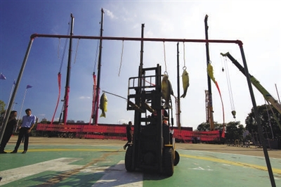 | 叉车钓鱼技能表演。 朱克锋 摄 |
