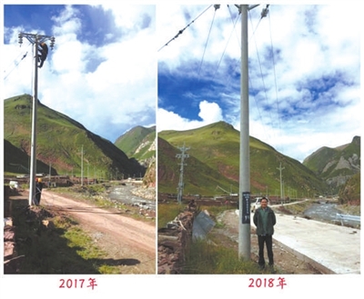 “钟卡日追支线一共311基电杆,一直通到山后最后一个村。”黄善南站在钟卡日追支线161基杆前合了张影,这是和去年一模一样的位置,青山不改,去年还在建设中的光秃秃的电杆,如今已连成了电力“五线谱”,承载着来自浙江的技术和温暖,跨越高山峡谷,把光明的乐章传到高原上的千家万户。