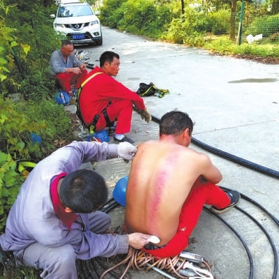 当天作业是高压停电变压器升高放20米出线电缆。由于气温过高,下了杆的谢义芳脸色苍白,双腿打着颤,脱去上衣后身上的汗水还不停往下淌。同事扶着他到阴凉处,将手中的饮用水泼他身上降温,又拿来了刮痧板为他刮痧。