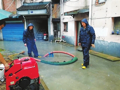 雨势渐小,新仓镇专职消防队副队长黄杰与手下3名队员站在淹没鞋子的水中密切注意着管子,保证抽水工作顺利进行。
