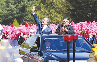 韩国总统文在寅9月18日上午乘专机抵达朝鲜首都平壤。朝鲜国务委员会委员长金正恩到机场迎接。两位领导人将在今后3天里举行今年以来的第三次会晤。图为韩国总统文在寅(左)与朝鲜国务委员会委员长金正恩乘车进入平壤市区。