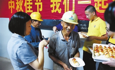 昨天下午,浙江省三建建设集团党委、工会联合杭州市杨绫子学校智慧树残疾人服务社,请擅长烘焙的学生和职工志愿者一起制作月饼,并送到该集团一、四分公司承建的杭州姚江路61号地块项目和杭州市全民健身中心项目建设工地,让民工们提前吃上又香又有爱的中秋月饼,感受佳节亲情和节日气氛。