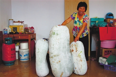 图为徐金花家中放着的3个大冬瓜,其中两个每个有60多斤重,中间那个冬瓜重113斤。