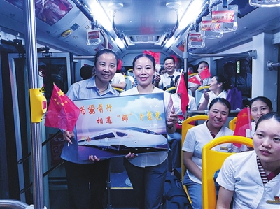 | 陈美芳(左二)和40余名乘务员共同乘坐陈霞娜(左一)的爱心公交车。 |