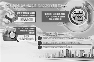 近年来,我国消费品标准化和质量工作加快推进,现有消费品国家标准和已经备案的行业标准近6000项,消费品标准体系逐步建立,其中家用电器、纺织服装、家具、玩具、鞋类产品等行业的国际标准转化率达到80%以上,消费品质量国家监督抽查合格率“十二五”期间增长了1.8个百分点。
