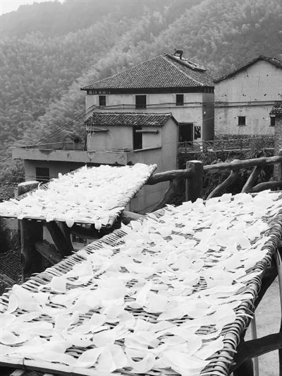 俗话说,“萝卜上市,郎中下市”,松阳县的高山萝卜白嫩多汁,秋冬季节食用有增强身体免疫的功效。在松阳县高山萝卜陆续成熟的季节,当地农户纷纷将萝卜片在竹垫上摊开,晒在自家的房前屋后,加工成“白片儿”。吃的时候,只要将萝卜片在水里泡一泡,然后放进骨头汤、鲫鱼汤里煮一煮,很是鲜嫩爽口,且萝卜又有润肺祛痰、解毒生津的功效,深受各地游客青睐。