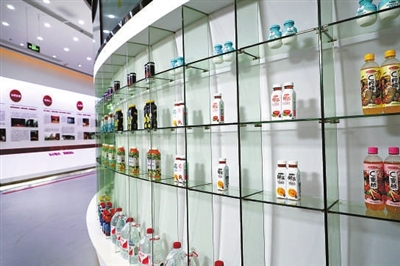 | 娃哈哈产品主要涵盖蛋白饮料、包装饮用水、茶饮料、果蔬汁饮料、咖啡饮料等10余类190多个品种。图为产品展厅一角。 见习记者邹伟锋 摄 |