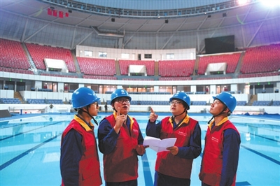 日前,在位于杭州奥体核心区的第14届世界游泳锦标赛(25米)场馆内,国网萧山供电公司技术人员正在讨论保电应急预案。