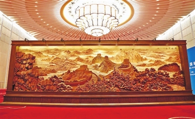 陆光正大师为上海国家会展中心创作的木雕作品《锦绣中华》,宽13米,高4.7米,深45厘米,为全景式山水木雕鸿篇巨作。其雕刻工艺全面展现当代东阳木雕最高超的技艺水准,选用多种上等木材,表现东阳木雕独有的空间构成艺术效果。作品将巍巍群山与宛若巨龙的雄伟长城置于画面之中,体现了中华民族的历史根脉,表达了中华民族巍峨屹立于世界之林的自信与百川汇海的壮阔气概。