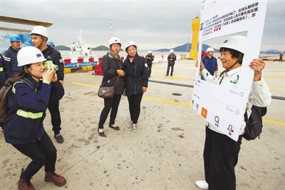 日前,宁波舟山港邀请近百名市民参观“东方大港”,感受改革开放40年来港口的巨大变迁。市民们通过参访宁波舟山港展厅听港史,登顶宁波最高标志性建筑——环球航运广场看城市发展,亲临宁波舟山港穿山港区感受码头生产一线等活动,零距离感受“东方大港”风采。图为工作人员为市民拍摄“拍立得”照片。