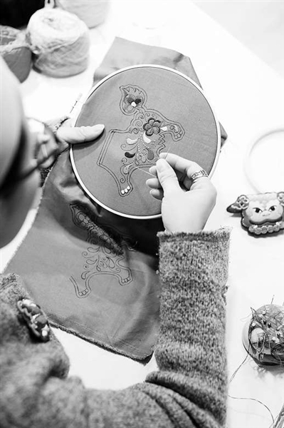 | “王的手创”品牌创始人王丹青正在创作国家非物质文化遗产“天塔狮舞”的衍生品。 |