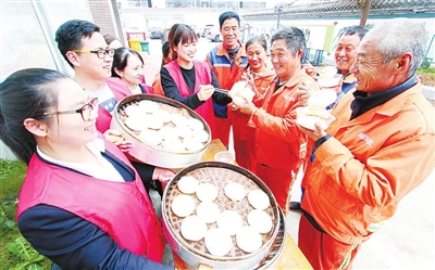 昨日清晨,台州市路桥区路桥街道新路村的党团员青年志愿者为环卫工人送上亲手制作的包子。路桥街道最近在青年党团员队伍中发起“我为环卫工人送一份早餐”和“我来当一天环卫工人”的志愿活动,以唤起全社会的环保意识和对环卫工人的感恩、敬重之情。通讯员蒋友青 摄