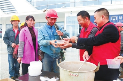 杭黄铁路开通在即,连日来气温下降,杭黄铁路及站前广场等配套工程的工人们却在加班加点赶工。属地的东兴村新时代文明实践站党员志愿服务队随即组织开展了“暖心粥送工友”活动,以感谢工友们的辛苦付出。