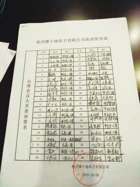 | 杭州雅士迪电子有限公司出席民主协商会议人员表决签名。 |