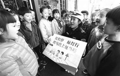 近日,台州市路桥区路桥街道中心幼儿园内,交警和党员志愿者正在向小朋友讲述交通安全常识。连日来,路桥街道组织公安民警和党员志愿者深入到各中小学校及幼儿园开展交通安全常识教育,增强学生交通安全意识,守护青少年平安成长。蒋友青 摄