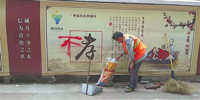 | 图为一环卫工人正在被喷上“不”字的公益广告栏前搞卫生。 |