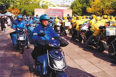 “我倡议:骑车佩戴头盔、过街礼让行人,不闯红灯不逆行,严格遵守交法,安全文明出行!”活动中,最抢眼的是身穿蓝黄工作服的百余名外卖小哥,他们在美团和饿了么公司代表带领下向社会倡议。现场活动结束后,百名外卖小哥沿西湖景区道路骑游宣传,到路口劝导,做起了文明交通志愿者。