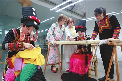 | 3名彝族绣娘正在中国工艺美术大师林霞(左二)等指导下学习。 |
