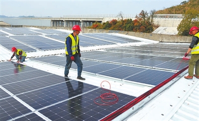 昨日,在玉环市龙溪镇的浙江万得凯流体设备科技股份有限公司厂房屋顶上,工人们正在安装光伏电站的电线。该公司充分利用1.2万多平方米的闲置厂房房顶资源,建起976千瓦分布式新能源光伏电站,节能减排,发挥经济环保的新效益。
