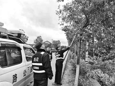 柯城公路:剪枝清理标志牌