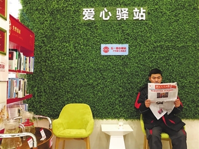 本报讯 见习记者何良玉报道 昨日,新年的第一份《浙江工人日报》送达舟山市总工会设在中信银行舟山分行营业大厅的“五一爱心驿站-户外职工休息点”,供快递员、清洁工等免费阅读。这是今年舟山市总工会为全市102家“五一爱心驿站”送去的精神食粮。