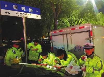 图为交警冒着严寒在昏黄的灯光下,围在一辆轿车的车后盖上吃盒饭。该场景被群众拍摄转发到朋友圈后获得连连点赞和好评。