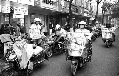 | 杭州市文三西路上一家食品店门口,“外卖小哥”在等待接单。 |