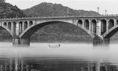 站在游艇甲板上缓缓行进,看两岸景色次第而过,像是在检阅新安江旖旎的山水风光,好不惬意。穿越一江氤氲雾霭,眺望新安江的碧波晨光,游艇的左舷是绵延叠翠的山峦,云遮雾挡,若隐若现,却更显灵动瑰丽;右侧碧蓝的江水倒映着沿岸鳞次栉比的高楼,犹如冰砌玉雕,如梦如幻的美景里展示着这座城市的繁华和蓬勃的景象。新安江大桥宛如长虹卧波,巍然而来;一江碧水纯净如蓝,悠然而去。偶有船舷溅起的浪花,惊扰了静卧在江面的薄雾,或四散而去,或飘忽而上,让我更加近距离看清楚新安江上这静如处子的曼妙精灵。