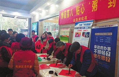 | 杭州市西湖区古荡湾社区于日前举办的“情暖腊八 贴心‘粥’到”活动,提前温暖了社区职工、离退休人员、孤寡老人、外来务工人员和创业者等众人心。社区还特意邀请书法家为大家现场泼墨,在送腊八粥的同时送上“福”字,让大家感受中国传统节日的喜庆气氛。 通讯员张菁 摄影报道 |