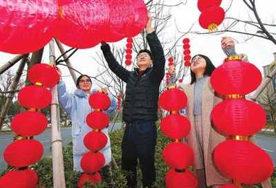 昨日,台州市路桥区路北街道党员志愿者正在辖区灵山街的道路两侧行道树上悬挂红灯笼,营造喜庆的氛围,喜迎新春佳节的到来。